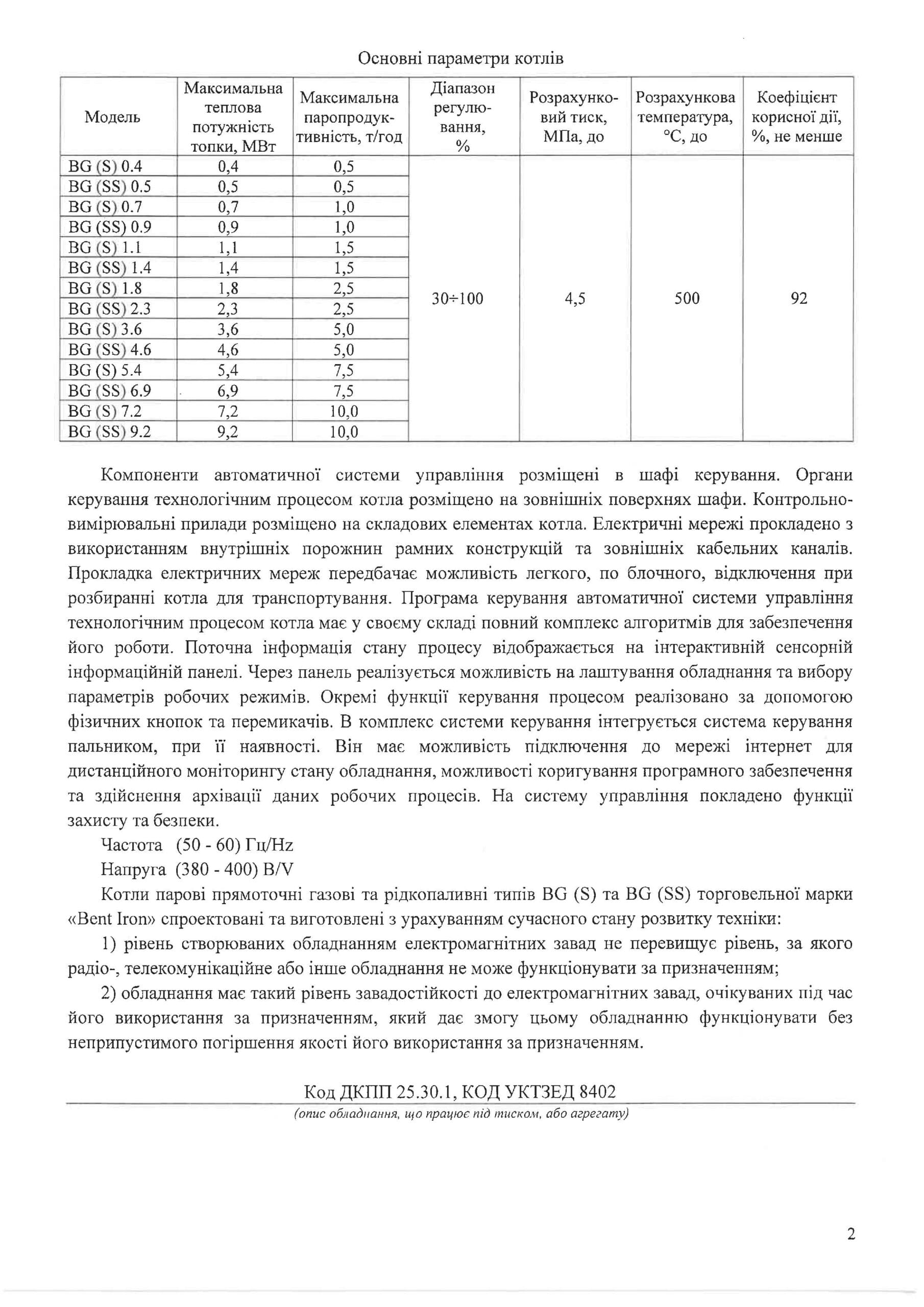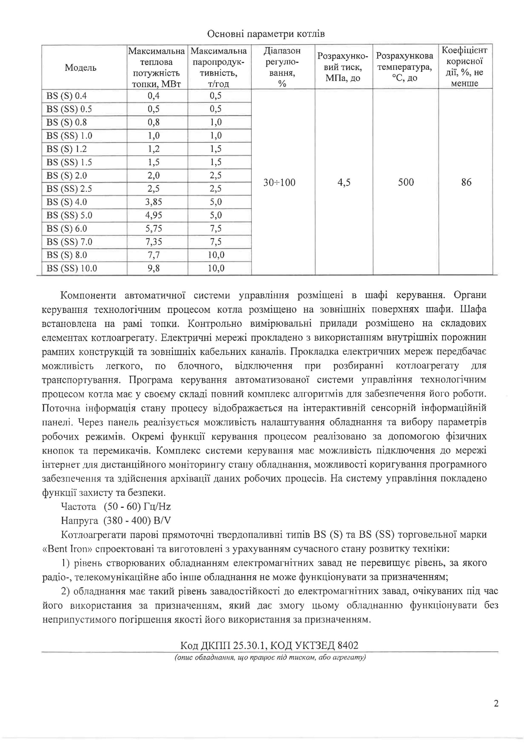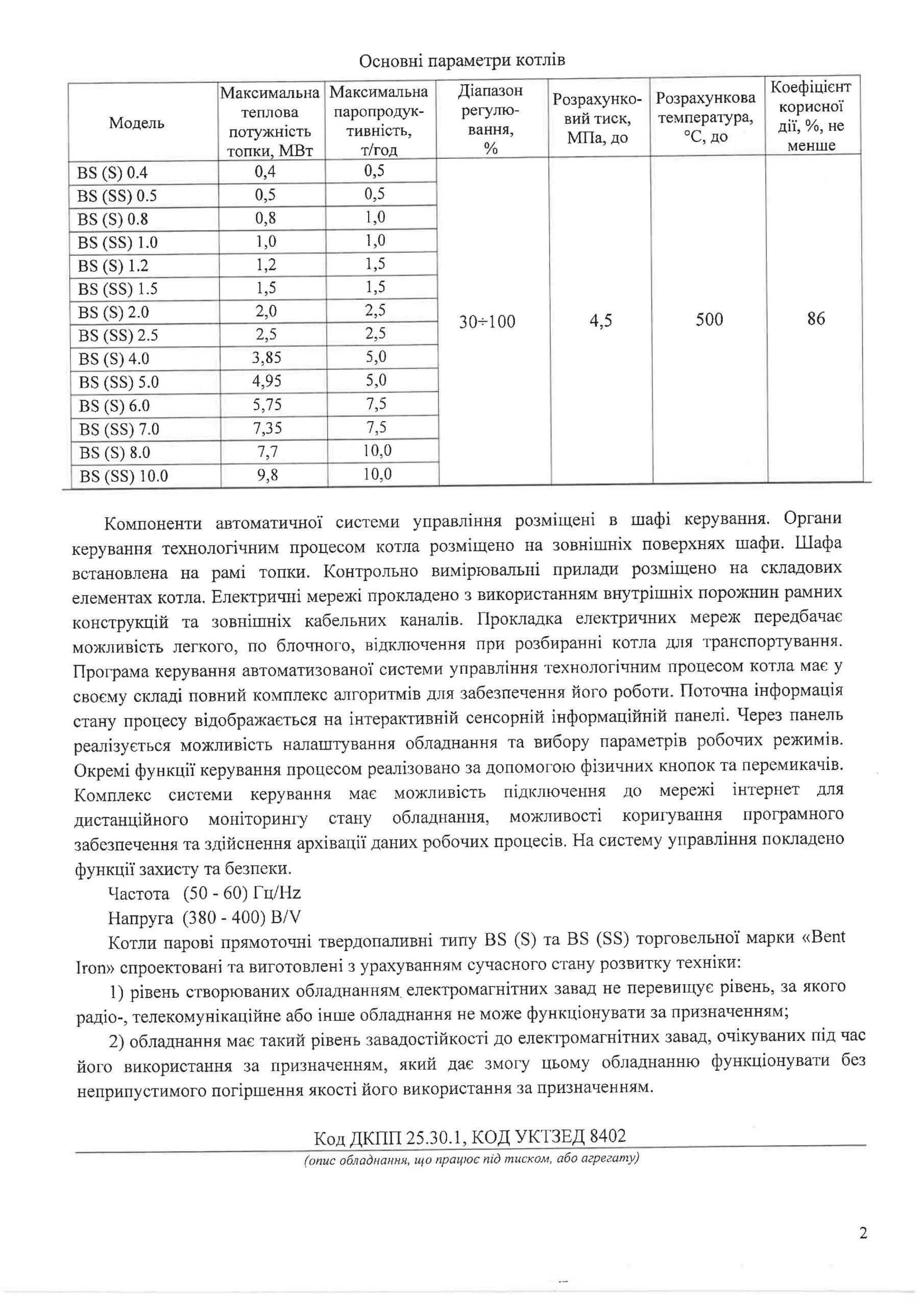 Номінальна паропродуктивність: 2500 кг/год