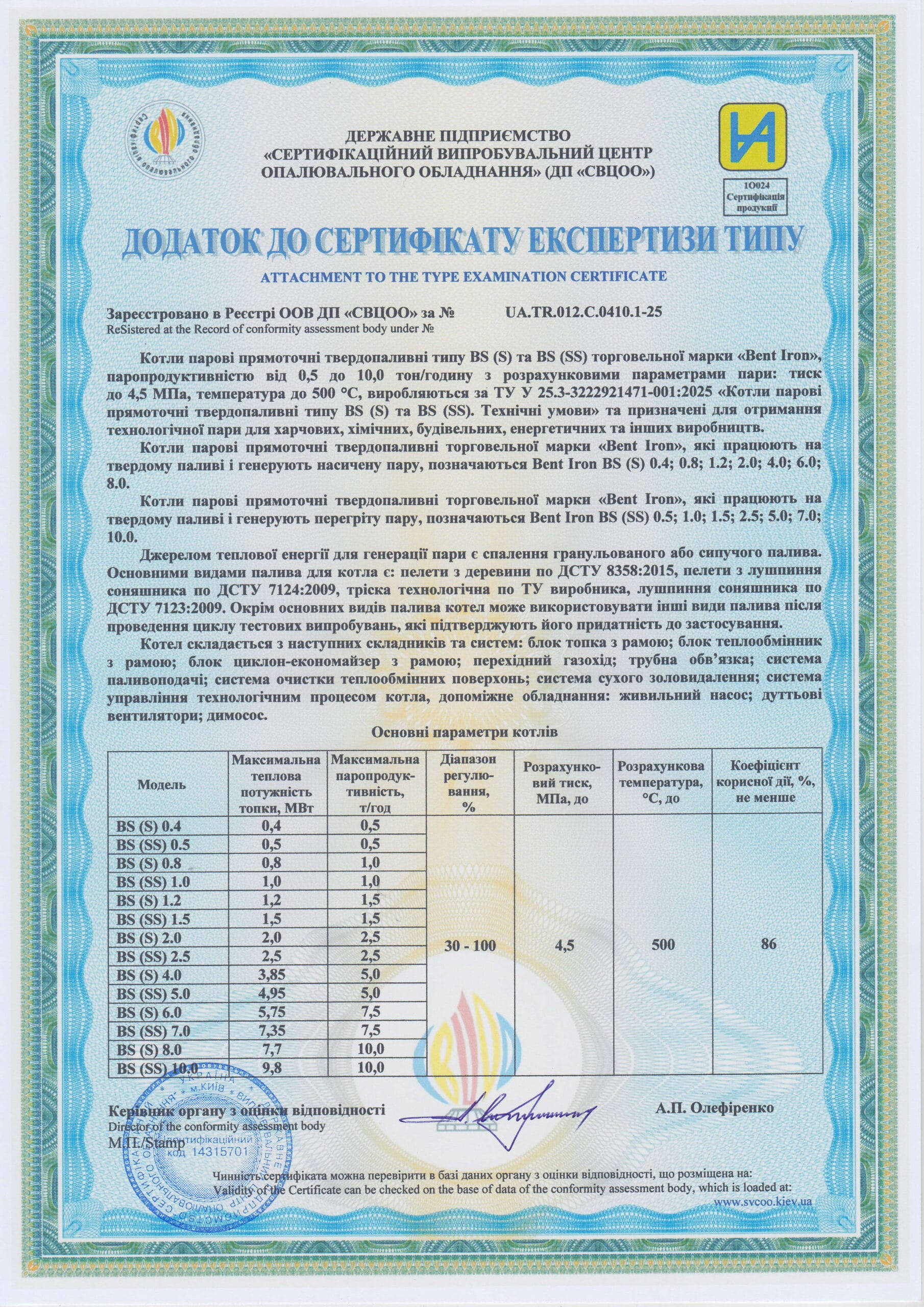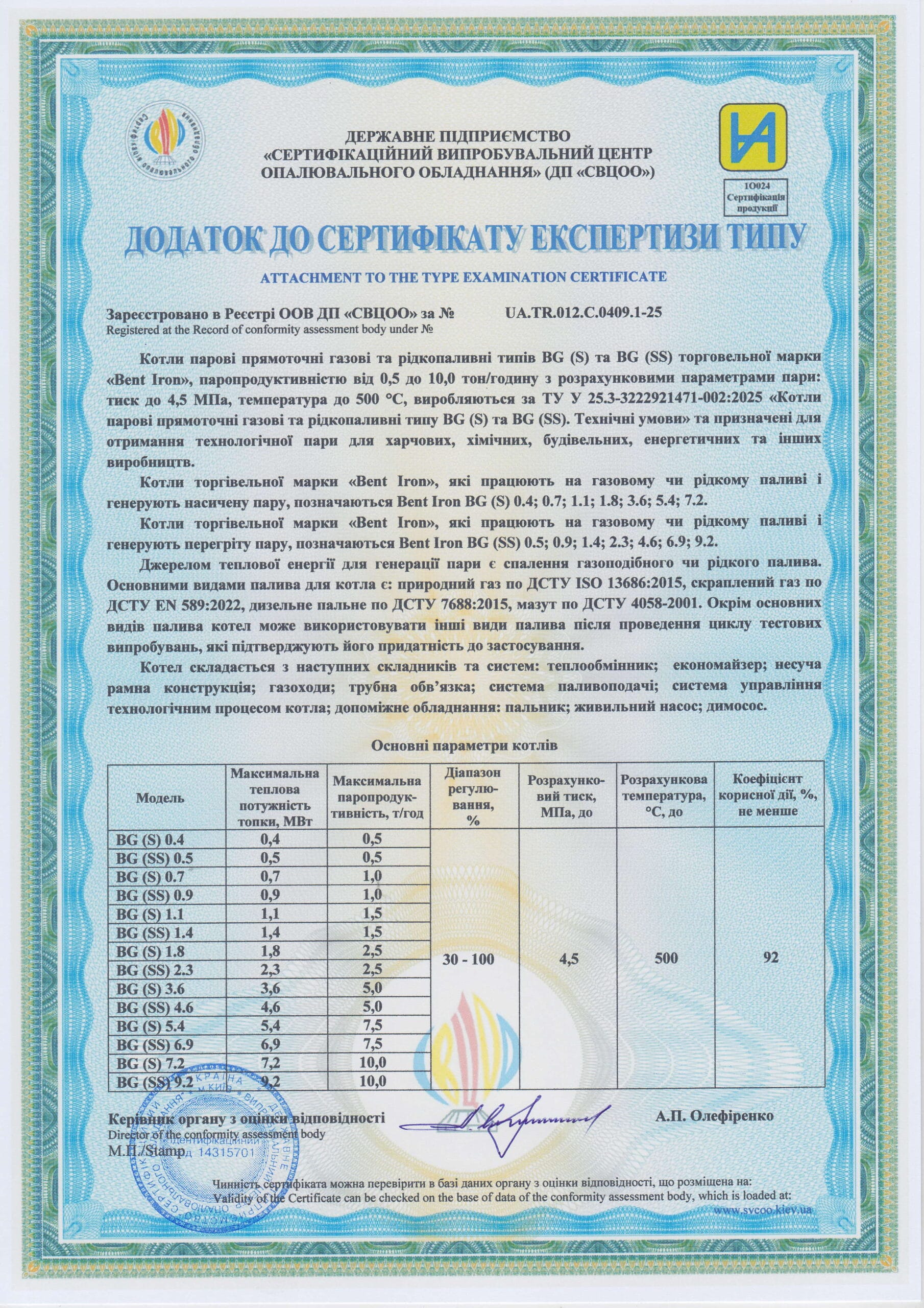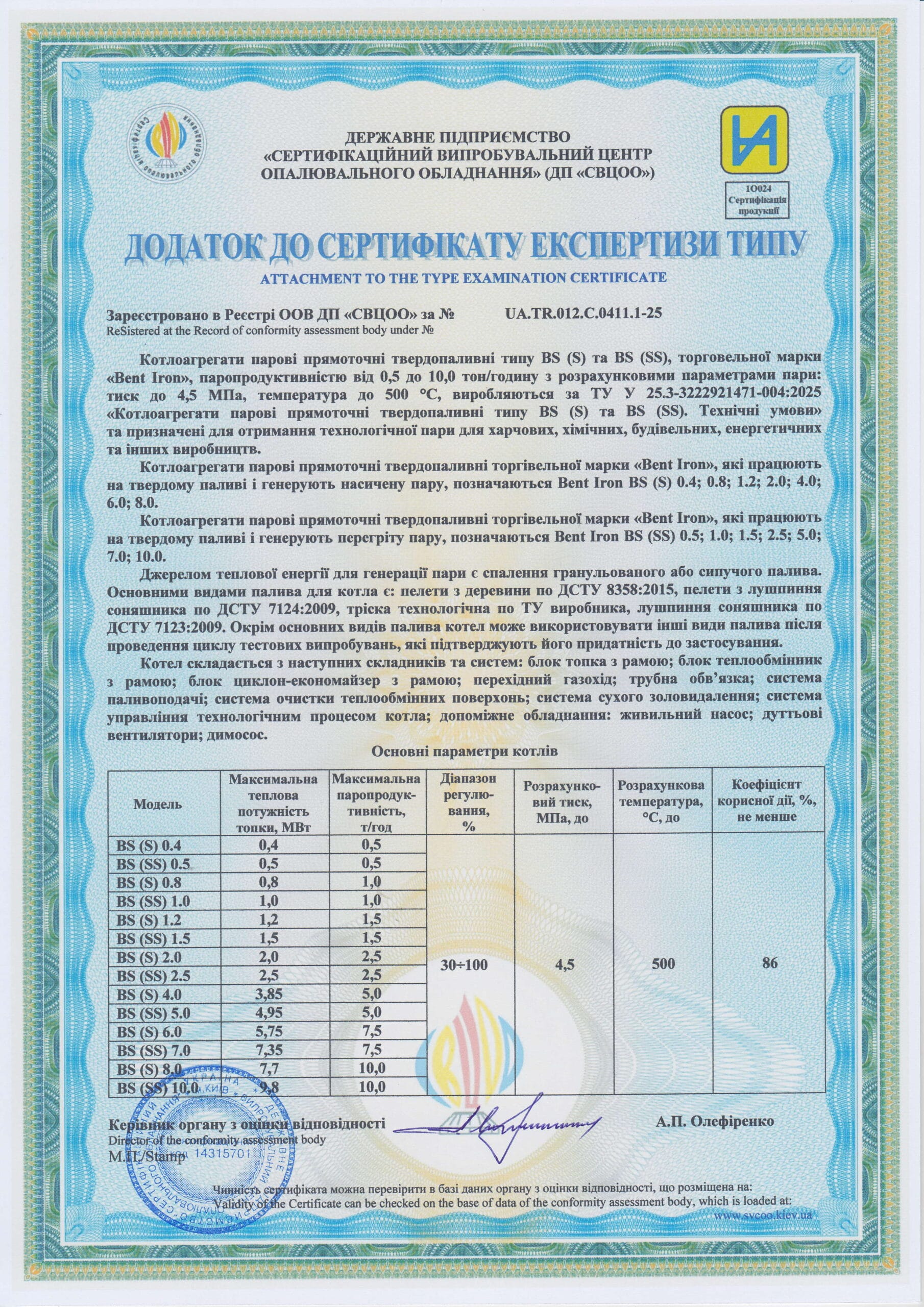 Парогенератори Бент-Айрон мають теплообмінник у вигляді змійовика, який має дуже низький обʼєм води у порівнянні з класичними барабанними котлами.