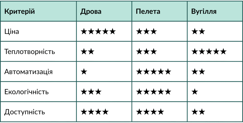 Якщо коротко: вугілля найпотужніше, пелети — середній клас, дрова — економ, але потребують ретельного сушіння.